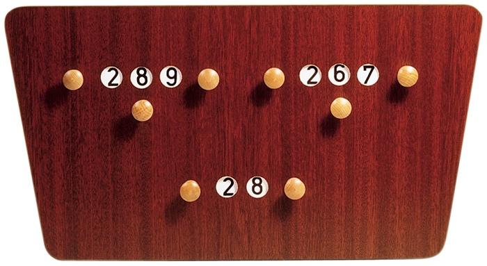 Groot scorebord voor carambole in een mooi houten frame, geschikt tot 3 spelers. De scoretellers lopen tot 999 punten. Afmetingen: 62 x 33 cm.